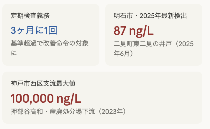 - 2025年も明石市内の井戸2カ所で基準値超えを確認。地下水汚染は拡散中の可能性