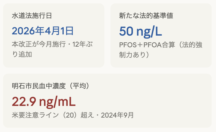 2026年4月1日、PFOSとPFOAが水道法の「水質基準項目」に正式追加され、全国の水道事業者に3カ月ごとの定期検査と超過時の改善措置が法的に義務付けられた。しかし神戸市西区・明石川流域では、産業廃棄物最終処分場に起因するとみられる汚染が現在進行形で続いており、2025年には新たに明石市内の井戸2カ所から基準値超えが検出。住民血中濃度は全国有数の高水準にあり、「飲み水は安全」という行政の説明と市民の不安の乖離は埋まっていない。法改正が「問題の終わり」ではなく「新たなスタートライン」であることを、現地の実態データと最新の行政動向から多角的に整理した。