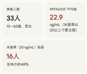 「明石川流域のPFAS汚染を考える会」が明石市民33人の血液検査結果を公表。4PFAS合計の平均値22.9 ng/mL、約半数(16人)が米国要注意ライン(20 ng/mL)超え。 -