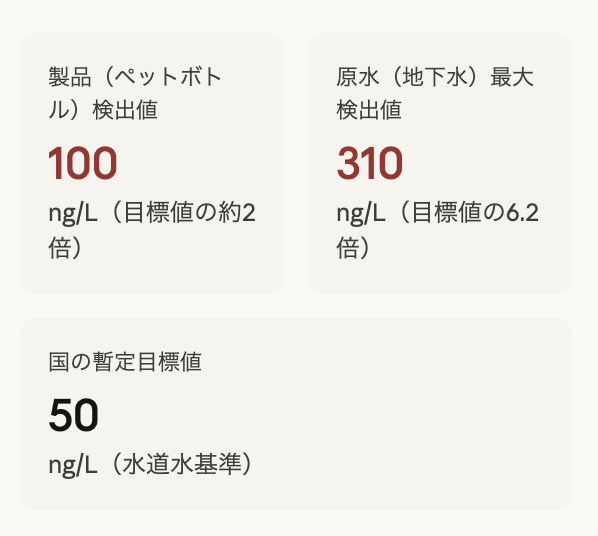 | 問題のミネラルウォーター(神戸市内製造・事業者名非公表) | 2023年に活性炭フィルター設置後は目標値以下に改善。現在は廃業・販売終了。 | 販売終了 |