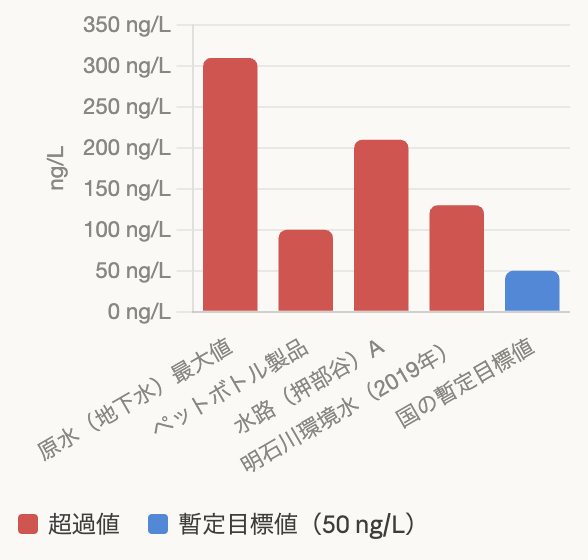 さらに遡ると、神戸市が2021年に実施していた非公表の調査では、同市押部谷町の明石川合流水路付近で33,000 ng/L(目標値の660倍)が検出されていたことが、情報公開請求により判明している。また神戸市が公表している2024年2月の調査では、西区平野町の地点で1,300 ng/Lという高い数値が出ている。