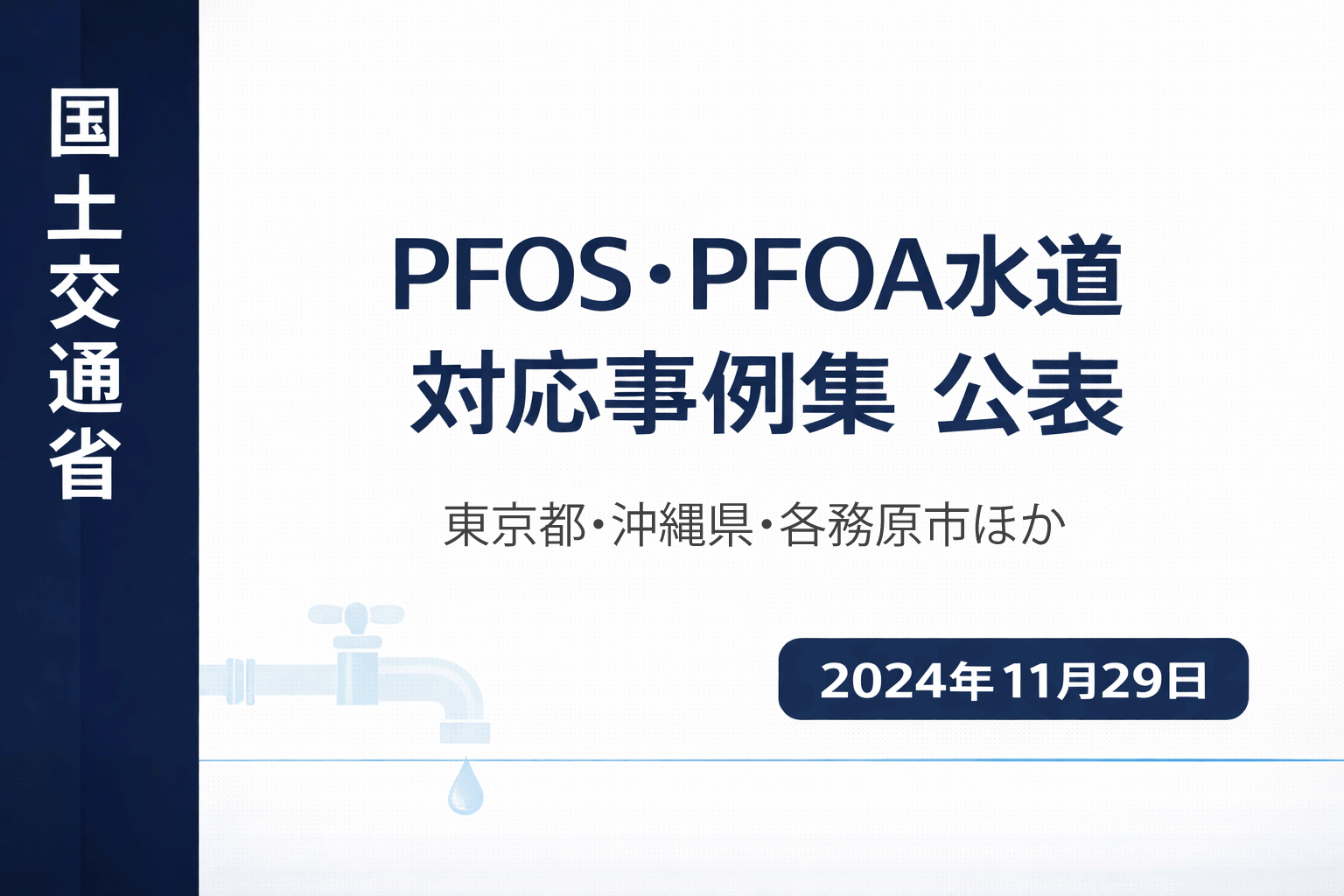2024年11月29日、国土交通省は「水道事業者等によるこれまでのPFOS及びPFOA対応事例について」を公表しました。東京都・沖縄県・各務原市など国内の水道事業者がこれまで実施してきたPFOS・PFOA対応の具体的な事例が収録されており、粉末活性炭の注入・代替水源への切替・粒状活性炭処理施設の整備など、実務に役立つ情報が掲載されています。