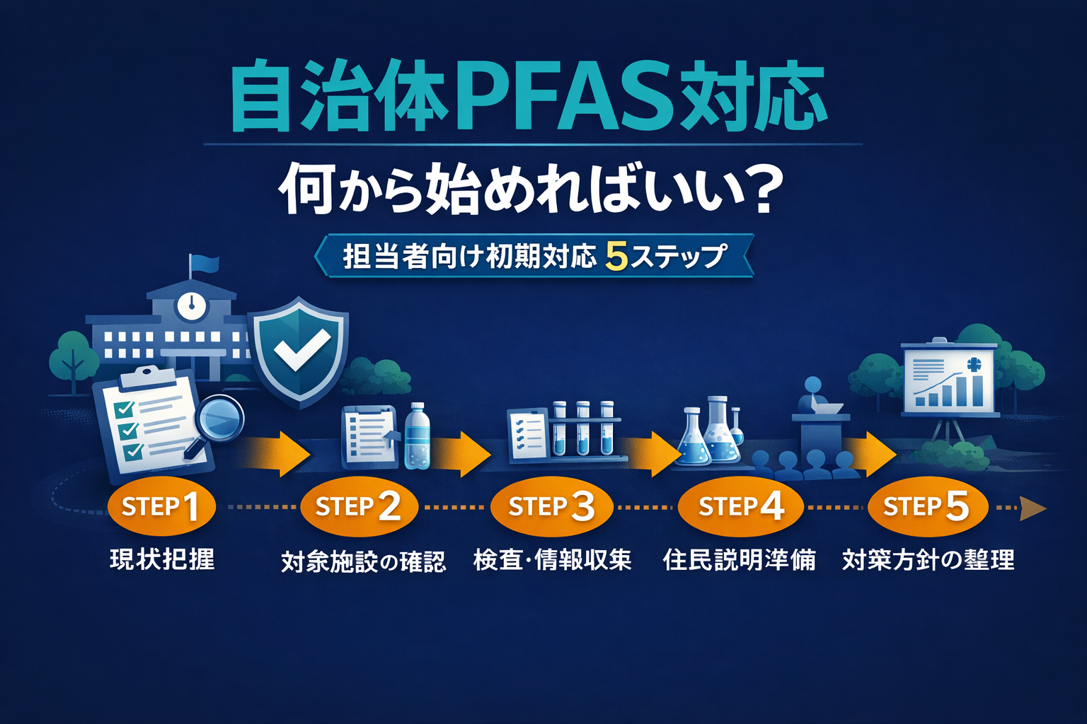こうした悩みを抱える自治体・水道事業者の担当者の方に向けて、PFAS対応の初期対応ステップをわかりやすく解説します。