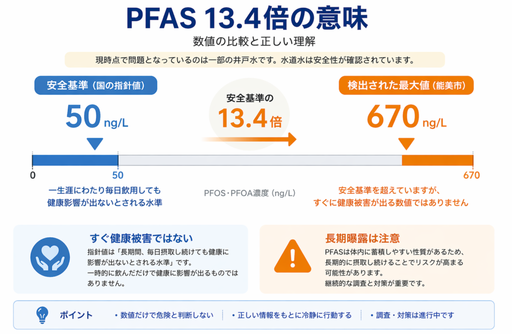 石川県能美市で、PFOS・PFOA(いわゆるPFAS)が国の指針値の13.4倍検出されたことが公表され、大きな関心を集めています。
