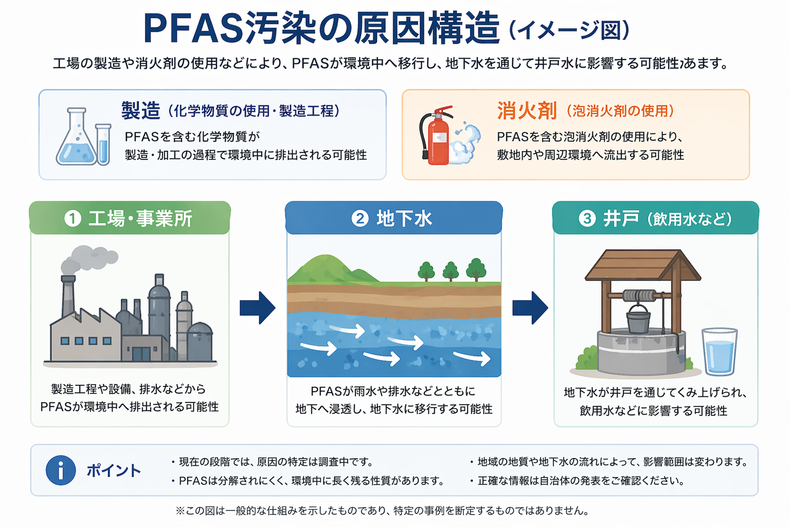 今回の能美市のPFAS問題は、過去の化学物質使用や管理のあり方が、長い時間を経て地下水問題として表面化しうることを示す事例です。