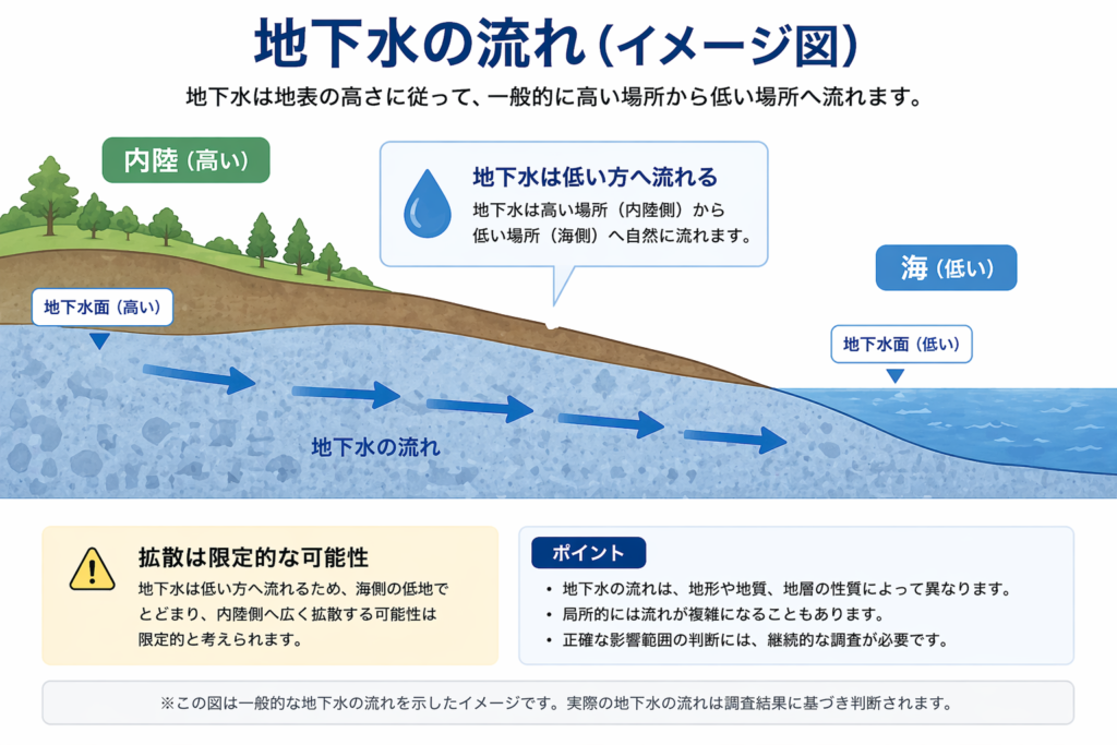 ただし、地下水の流れは地層構造や局所的な水の動きに左右されるため、「海側だから絶対に広がらない」「周辺地域は完全に安全」とまでは言えません。