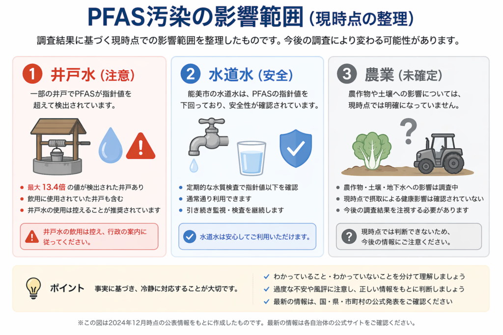 結論から言うと、現時点で確認されているのは主に一部井戸水の問題であり、水道水については安全性が確認されています。